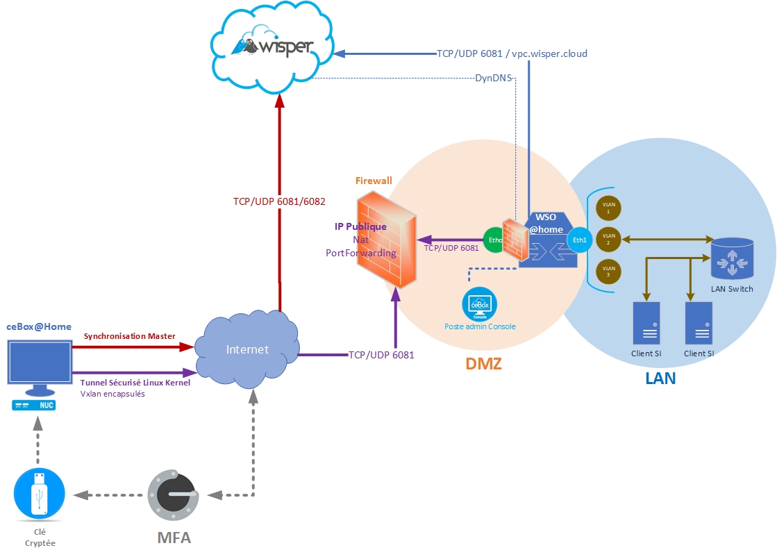-Les flux métiers (accès au SI, accès aux différents applicatifs, gestion de la sécurité) tunnelisent vers le WSO@Home® du client.